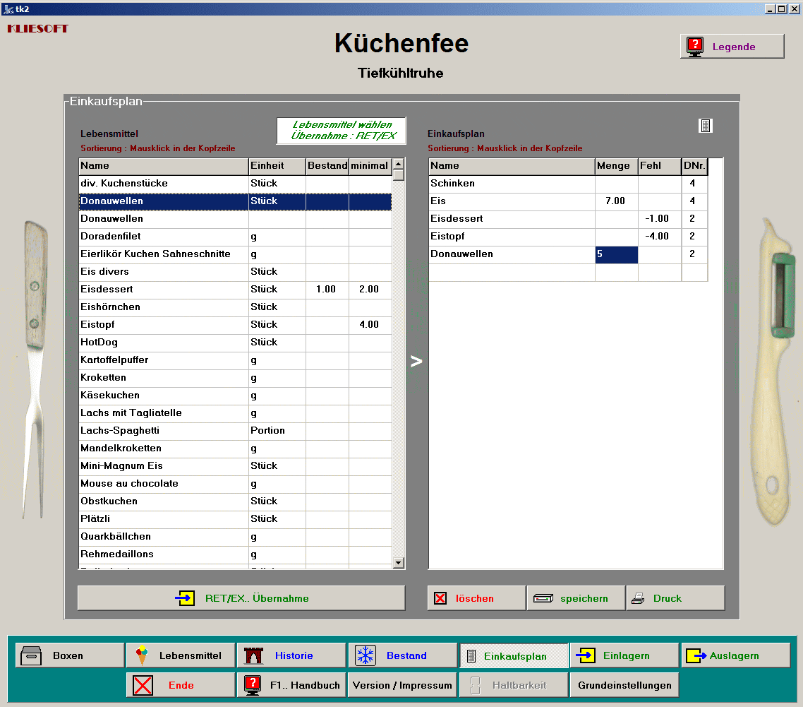 Das will das kleine Programm Küchenfee vermeiden. Höchst einfach in der Bedienung verschafft Küchenfee Ihnen jederzeit Überblick über den Inhalt Ihrer Tiefkühlgeräte und einen direkten, gezielten Zugriff auf jede der Einlagerungen. Dabei können Verfallsdaten ebenso überwacht werden wie gewünschte Mindestbestände bestimmter Lebensmittel.